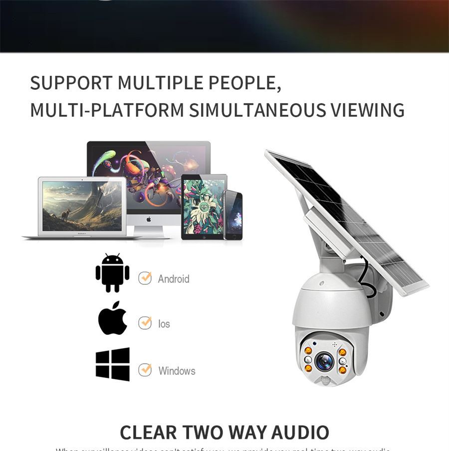 4. Pan Tilt Broader View& کنترل از راه دور --- دوربین خورشیدی ptz زاویه دید 360 درجه افقی و 120 درجه چرخش عمودی را فراهم می کند. از کنترل از راه دور جهت روی تلفن شما پشتیبانی می کند. با ویژگیهای زوم دیجیتال 3 برابر و اشتراکگذاری چند کاربره، که نمای منعطفتر و وسیعتری را برای شما و خانوادهها فراهم میکند تا بتوانید خانهتان را در دید همه جانبه در زمان واقعی نظارت کنید. انتخاب دوربین خورشیدی در فضای باز از خانه شما 24/7 محافظت می کند.